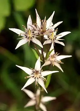 Квітконос прямий, галузиться лише у верхній частині. Суцвіття — кінцева вузьколанцетна волоть 7—12 см завдовжки, складена з кількох півзонтиків, що загалом може налічувати від однієї до сорока квіток. Квітконіжки нижніх квіток довгі, квітконіжки верхніх за розміром дорівнюють самим квіткам. Квітки актиноморфні, двостатеві, п'ятичленні (дуже рідко — чотиричленні[9]), без запаху. Чашечка завдовжки 4—8 мм із дуже короткою трубкою, яка може бути відсутня. Чашолистки вузьколінійні, загострені, коротші за оцвітину, зелені або зеленкувато-фіолетові. Оцвітина, подібно до чашечки, також має надзвичайно коротку (1,5-2 мм завдовжки) трубку, яка подекуди може бути не виражена взагалі — її долі розсічені майже до самої основи. Пелюстки завдовжки 10—16 мм[2], завширшки до 4 мм, видовженоланцетні, ближче до верхівки звужені, мають гострі, загострені або тупуваті кінці. Зазвичай вони мають брудно-фіолетовий, сіро-синій чи синьо-фіолетовий колір із поздовжніми переривчастими (пунктирними) темно-фіолетовими смугами; дуже рідко основне тло пелюсток може бути жовтувато-зеленим. При основі кожної пелюстки розташована пара круглих ямкуватих нектарників завширшки до 1 мм із війчастими чи бахромчастими краями[8]. Самі нектарники темно-фіолетового кольору, а їхні війки чорно-червоні. Тичинок п'ять, тичинкові нитки завдовжки 6—8 мм, в нижній частині круглі в перерізі, ближче до верхівки пласкі, вони можуть бути як фіолетового, так і зеленого кольору. Пиляки завдовжки 1,5-2 мм, темно-брудно-фіолетові чи зеленкувато-жовті, еліптичні, дволопатеві, розташовані паралельно вісям тичинкових ниток. Маточка заввишки 5-6 мм із дуже коротким стовпчиком.