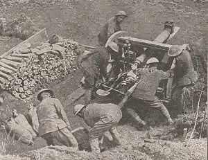 ![]() Британські артилеристи здійснюють переміщення 84-мм польової гармати QF 18-pounder на нову вогневу позицію у ході першої битви за Скарпе. Битва біля Аррасу. Квітень 1917 Британські артилеристи здійснюють переміщення 84-мм польової гармати QF 18-pounder на нову вогневу позицію у ході першої битви за Скарпе. Битва біля Аррасу. Квітень 1917 | |||||||||