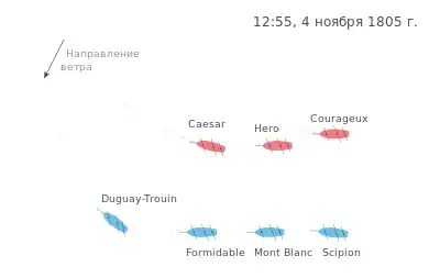 Приблизно о 12:15 «Caesar» відкрив вогонь з гармат лівого борту по «Formidable», а через пару хвилин «Hero» і «Courageux» розрядили свої гармати в «Mont-Blanc» і «Scipion». Три французьких кораблі відкрили у відповідь вогонь і пішла запекла перестрілка. У цей час «Namur» був приблизно в 10 милях від місця бою, докладаючи всіх зусиль, щоб якомога швидше прийти на допомогу своїм товаришам. О 12:50 «Caesar» підняв сигнал вступити в ближній бій[12]. О 12:55 «Duguay-Trouin» був приведений до вітру з наміром обстріляти ніс «Caesar», але той вчасно ухилився і зміг уникнути залпу. При цьому, здійснюючи поворот на лівий галс, «Duguay-Trouin» сам отримав два нищівних залпи: один від «Caesar», а другий, ще більш руйнівний, від «Hero»[13].
