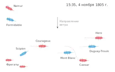 Бачачи що сталося з «Scipion» і «Formidable», «Duguay-Trouin» і «Mont-Blanc» спробували втекти, але незабаром їх наздогнали «Hero» і «Caesar»[17]. Після 20-хвилинної перестрілки, отримавши серйозні пошкодження від залпів важких гармат британського 80-гарматного корабля, два французьких 74-гарматників опинилися в безпорадному стані, і бачачи, що ще і «Courageux» готовий відкрити вогонь, спустили прапори і здалися, «Duguay-Trouin» здався «Hero», а «Mont-Blanc» «Caesar»[16]. Це сталося приблизно о 15:35 і до цього моменту ескадри перебували в положенні, показаному на рисунку.