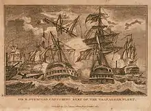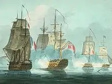 | «Duguay-Trouin» (74) | капітан Клод Тюффет | 150 убитих і поранених | Захоплений, прийнятий у склад флоту як HMS «Implacable» | |
