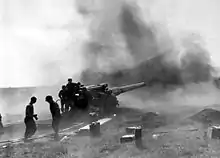 Американська польова артилерія веде артилерійський вогонь по позиціям німецьких військ у Бресті. Серпень 1944