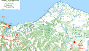 ![]() Мертві солдати і знищені танки японської 17-ї армії в гирлі річки Матанікау після провалу наступу на позиції морської піхоти США, 23–24 жовтня 1942 року. Мертві солдати і знищені танки японської 17-ї армії в гирлі річки Матанікау після провалу наступу на позиції морської піхоти США, 23–24 жовтня 1942 року. | |||||||