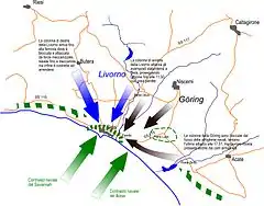 На суходолі одночасно почали атаку війська Осі: з боку західного берега річки Джела атакували гірські стрільці 4-ї дивізії «Ліворно», зі східного краю на плацдарм 1-ї піхотної дивізії наступали підрозділи «Герман Герінг». На позиції американців двома колонами поринули 60 танків Panzer III і Panzer IV, які вціліли після попереднього бою. На обох флангах зав'язалися запеклі бої, місцями американській піхоті доводилося відступати під тиском противника. Згодом морському десанту надала підтримку корабельна артилерія, що почала влучно уражати бронетехніку італійців та німців.