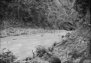 ![]() Кінець січня 1942 року. Австралійські солдати (праворуч у центрі) відступають з Рабаулу перетинаючи річку в горах на східній стороні півострова Газель. Фотограф: сержант Роббінс. Кінець січня 1942 року. Австралійські солдати (праворуч у центрі) відступають з Рабаулу перетинаючи річку в горах на східній стороні півострова Газель. Фотограф: сержант Роббінс. | |||||||