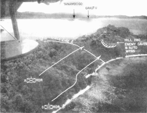 Морські піхотинці змогли встановити два кулемета Браунінга, якими вони стали придушувати вогонь з печер Гавуту, що дозволило продовжити висадку і просунутися вглиб острова. Очікуючи прикриття, морські піхотинці роззосередилися і незабаром їх положення стало критичним. Капітан Джордж Стеллінг, який командував батальйоном, наказав морським піхотинцям почати щільний вогонь кулеметів і мінометів по позиціям японських кулеметників на Танамбого. Незабаром американські бомбардувальники скинули декілька бомб на Танамбого, зменшивши інтенсивність вогню з цього острова.[39] Приблизно через дві години морські піхотинці досягли Висоти 148 і піднялись на неї. Підіймаючись на вершину, морські піхотинці винищували японців на пагорбі, з більшої частини якого продовжував йти вогонь, за допомогою вибухівки, ручних гранат і врукопашну.[40] Досягнувши вершини пагорбу, морські піхотинці також отримали можливість збільшити інтенсивність вогню на Танамбого.[41] Командир батальйону морської піхоти на Гавуту передав радіограму генералу Рупертусу, просячи підкріплення до початку атаки на Танамбого.[42]