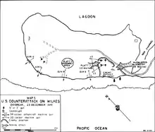 8 грудня 1941 року 36 японських літаків Mitsubishi G3M, розташованих на авіабазах островів Рой та Намур в північній частині атолу Кваджалейн на Маршаллових островах, почали бомбардування острова, знищивши 8 з 12 літаків. На світанку 11 грудня в районі острова з'явились японські сили під командуванням контр-адмірала Садаміті Кадзіока у складі: 3 легких крейсерів «Юбарі», «Тенрю», «Тацута»; 6 есмінців першого класу «Хаяте», «Яйой», «Оіте», «Асанагі» типу «Камікадзе», «Муцукі», «Кісарагі» типу «Муцукі»; 2 патрульні човни No. 32 (колишній есмінець другого класу «Аоі» типу «Момі»), No. 33 (колишній есмінець другого класу «Хагі» типу «Момі») типу No. 31; 2 військово-транспортні човни. Коли японські кораблі наблизились до острова, артилеристи морської піхоти відкрили вогонь з 127-мм гармат, а літаки-винищувачі піднялись в повітря. Після того, як два есмінці були потоплені, а два крейсери отримали пошкодження, японці відійшли, так і не висадивши десант.