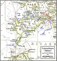 О 04:00 29 вересня (12 жовтня) після вогневого придушення російських берегових батарей та зачищення акваторії від мін розпочалася операція «Альбіон» — захоплення островів Моонзундського архіпелагу (Езель, Даго та Моон, на той час територія Автономного правління Естонії у складі Російської республіки). Висадка німецького морського десанту спочатку проводилася у невеликій бухті Тагалант на північному заході острова Езель[67].