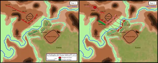 На лівому фланзі римлян X і IX легіони боролися проти атребатів. Римлянам вдалося збити противника в річку, після чого вони почали переслідування і багатьох переправлених на інший берег атребатів перебили. Однак самі легіони не стали форсувати річку, чим скористалися белги. Вони повернули на римлян, відновили бій, але були звернені у втечу.
