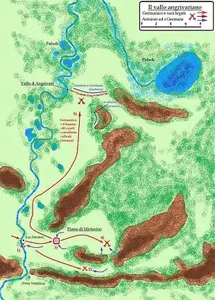 Піхота германців розташувалася по всьому валу, в той час як кавалерія була прихована в сусідніх лісах для того, щоб зайти в тил легіонам, як тільки вони, пройшовши ліс, опиняться перед валом. Германік дізнався від своїх інформаторів про ворожі плани і розділив піхоту на дві групи: перша мала атакувати позиції противника у лісі, а друга - зайняти вал. Легіони, які наступали рівниною не мали особливих проблем, а ті хто мав захопити вал зазнавали постійних втрат під ударами ворогів зверху. Германік, помітивши труднощі, які виникли вздовж ангріварської стіни, вирішив відвести легіони, для уникнення постійних втрат, і просунув лінії лучників і пращників. Під густим вогнем римських стріл і каміння, германці зазнавали важких втрат. Незабаром, римські бойові машини почали вести вогонь дротиками і стрілами, щоб остаточно розбити захисників стіни. Далі послідувала атака легіонів. Ангріварський вал був взятий і Германік, разом з преторіанськими когортами, особисто очолив атаку на рівнинах у лісі, де битва була особливо жорстокою і кривавою. Наявність болота перешкоджала відступу германців, тоді як річка і гірська місцевість ускладнювали будь-який римський відступ; обидві сторони повинні були перемогти задля того, щоб вижити[12]. Боротьба була запеклою і германці проявили велику завзятість, але римляни переважали завдяки своїй дисципліні, озброєнню і тактичній згуртованості. Легіонери вишикувані в щільному утворенні, захищеному великими щитами, завдавали тяжких ушкоджень германцям гладіусами, що викликало страшні рани на грудях ворожих воїнів. Германці не могли ефективно використовувати свої довгі списи через відсутність простору і не могли протистояти важкоозброєній піхоті противника[13]. Арміній, змучений боєм і потерпаючи від ран, почав тікати з поля бою, так само як Інгвіомер. Германік, навпаки, зняв шолом, щоб бути впізнаним усіма, закликав легіонерів до розправи. Він наказав не брати полонених, мотивуючи це тим, що тільки винищення германців закінчить війну. Наприкінці дня він відкликав з поля бою легіон, для того щоб побудувати табір, а інші продовжили різанину до темряви. Після перемоги, римляни насипали курган з написом: «Армія Цезаря Тиберія, після того, як підкорила племена між Рейном і Ельбою, присвятила цей пам'ятник Марсу, Юпітеру і Августу». Разом з тим, Германік наказав Стертінію виступити проти ангріваріїв, задля впевненості в їхній покірності Риму. Ті, в свою чергу, смиренно прийняли мир на умовах римлян[14].