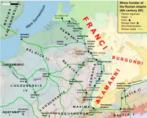 Імовірно в ІІІ ст. н.е. германські племена Germania Libera «вільної Германії » , германських земель, які перебували за межами Римської імперії, почали об'єднуватися у великі союзи племен: франків (північно-західна Німеччина ), алеманів (південно-західна Німеччина) і бургундів (центральна Німеччина)[1]. Незважаючи на зберігаючу внутрішню ворожнечу між племенами, ці союзи через свою численність стали становити велику загрозу для імперії.