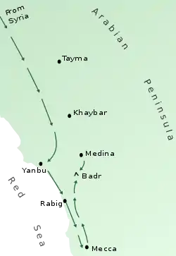 У мекканській період діяльності Магомета він і його сподвижники піддавалися усіляким нападкам, погрозам, бойкотам, побиттям, знущанням, загрозам смерті. Це спонукало Магомета спочатку переселити мусульман до Ефіопії (сам він залишився в Мецці), а потім переселитися в Йасріб (Медіну), де місцеві жителі прийняли іслам. У Магомета з'явилася підтримка населення Медіни і армія відповідно. Але армія курайшитів була більш чисельною і перший час мусульмани лише збирали відомості про каравани курайшитів що проходил повз Медіну, а потім Магомет вирішив напасти на один з них. Такі напади на каравани (мусульмани нападали тільки на каравани курайшитів) чинили тиск на верхи Мекки, також вони могли бути викликані ще й тим, що у мусульман залишилося багато майна у Мецці і це було свого роду поверненням забраного.