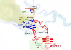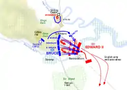Тим часом англійські війська продовжували наступ на Стерлінґ. Шотландський король умілими маневрами перерізав усі прямі шляхи на місто, проте Едуард II обрав найбільш невдалий і небезпечний маршрут, що пролягав через містечко Беннокберн. Увечері англійський король віддав наказ про передислокацію військ на рівнину між річками Беннокберн і Форт. Як наслідок, англійці виявилися на вкрай обмеженій та заболоченій ділянці. Незабаром після настання світанку наступного дня вранці шотландські списники, об'єднані в три баталії, почали наступ на англійські позиції. Едуард був сильно здивований появою з лісу шотландської армії. Тим часом воїни Роберта I Брюса, наблизившись до англійських позицій, опустилися на коліна для молитви. Здивований англійський король, за переказами, сказав, що вони просять про милосердя, проте один з його наближених натякнув, що шотландці просять милості у Бога, але ніяк не в англійського короля.