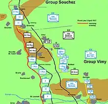 Безпосередньо оборону хребта утримували три німецькі лінійні дивізії, що складалися з семи піхотних полків. Чисельність кожної дивізії становила приблизно 15 000 осіб, але їх фактична укомплектованість була значно меншою[18]. Тому на квітень 1917 року, до початку наступ кожен німецький полк на хребті утримував смугу завширшки приблизно 1000 метрів і коли Канадський корпус атакував, на позиції кожної німецької роти наступало два і більше піхотних батальйони по 1000 людей у кожному[19]. Відповідно до теорії поглибленої оборони, резервні дивізії перебували в районах зосередження на відстані приблизно 24 кілометрів у готовності діяти на визначених напрямах у разі загрози прориву сил противника[20].