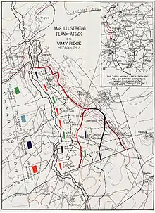 Наступ Канадського корпусу розподілявся по чотирьох кольорових лініях або рубежах досягнення визначених об'єктів. Атака проводилася на фронті 6400 м, з напрямом головного удару навпроти села Вімі, на схід від хребта[11]. Першим рубежем або метою була Чорна лінія — захоплення передньої лінії оборони німців[12]. Кінцевою метою північного флангу була Червона лінія: захоплення найвищої точки на хребті, укріпленого пагорба, відомого як «Прищик», ферми Фолі, траншеї Цвішен-Стеллунг і села Ле-Тілль. Дві південні дивізії повинні були досягти двох додаткових цілей: Блакитну лінію, що простягалася від села Телус і ліси за селом Вімі, і Коричневу лінію — траншея Цвельфер-Грабен і німецька друга лінія оборони[12][13].