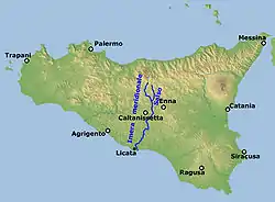 ![]() Мапа Сицилії з позначеною річкою Гімера (наразі Сальсо), неподалік від якої сталась битва Мапа Сицилії з позначеною річкою Гімера (наразі Сальсо), неподалік від якої сталась битва | |||||||