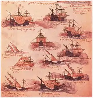 - 5 великих нау (карак) : Флор-ду-Мар (флагман віцекороля; капітан Жуан да Нова), Еспіріто Санту (капітан Нуно Ваз Перейра), Белем (Хорхе де Мело Перейра), Рей Гранде (Франсіско де Тавора) і Тафореа Гранде (Перо Баррето де Магельеш)