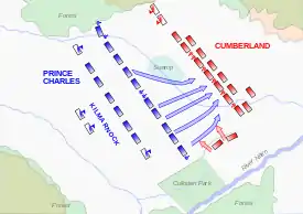 Шотландці ввійшли до битви змучені невдалим нічним маршем і вишикувалися в 2 лінії — у першій лінії стояли найбоєздатніші кланові полки горян, у другій — батальйони ловлендерів, ірландський і французький контингенти. В обличчя шотландцям дув сильний вітер.