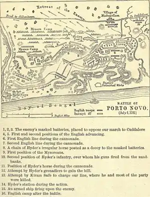 Битва при Порто-Ново відбулася 1 липня 1781 року між силами князівства Майсур і підрозділами Британської Ост-Індійської компанії, є складовою частиною другої англо-майсурської війни. Британські частини під командуванням Ейре Кута силами до 8000 осіб перемогли сили Гайдара Алі, які оцінюються в 40 000. Сили Майсуру відступили в напрямку Канчіпураму, втрати військ Гайдара Алі оцінюються в 10 000.