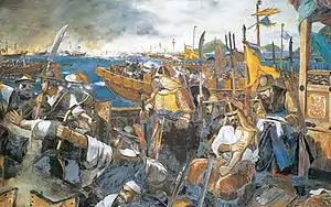 ![]() Поранений Лі Сунсін у битві при Сачхоні Поранений Лі Сунсін у битві при Сачхоні | |||||||