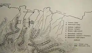 Римська піхота була атакована піхотою Карфагена; римляни наполегливо захищалися, не зважаючи на те, що їх фланги були охоплені кіннотою супротивника. В цей час загін карфагенян із засідки ударив в тил римлянам, що внесло замішання до їх рядів.