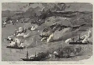 Використавши жердинні міни, два французькі міноносці здрейфували вниз за течією у напрямку якірної стоянки нейтральних кораблів. Під час атаки лейтенант Латур був важко поранений в око, але він відмовився від пропозиції медичної допомоги американських офіцерів з парового шлюпу "Ентерпрайз", пояснивши, що не може залишити свій пост, поки битва ще триває.