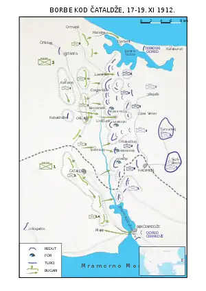 Битва розпочалося 17 листопада з артилерійської підготовки і наступу болгарських військ. До 9 години ранку три болгарські дивізії увійшли в кілька прифронтових сіл, але опівдні до берега підійшли турецькі монітори і вогнем підтримали сухопутні війська. Увечері болгарській армії вдалося трохи просунутися вперед, зайнявши кілька редутів противника. У ніч на 18 листопада турецькі війська контратакували, відкинувши болгар на вихідні позиції. Рівна кількість сил у протиборчих сторін, втома болгарської і деморалізованість турецької армій змусили сторони припинити військові дії і почати мирні переговори в Лондоні. Переговори були зірвані в початку 1913 року турецькою стороною, через що війна відновилася.