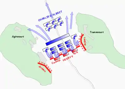 Воїни центру розташовувались в лінію з 4 чоловік глибиною і 250—300 солдат шириною. На флангах були поставлені англійські та валлійські лучники, що укріпили свої позиції рядами дерев'яних жердин, вритих у землю під гострим кутом до противника. Ця тактика, нова для англійців, можливо з'явилась під впливом успіхів османської армії під Нікополем, де османські лучники використовували дерев'яні жердини для оборони від бургундської кінноти[7]. Шикування англійців було вдалим: вузький простір заважав діям французької кінноти, натомість глибокий бруд щойно зораного поля сильно ускладнювала маневреність.