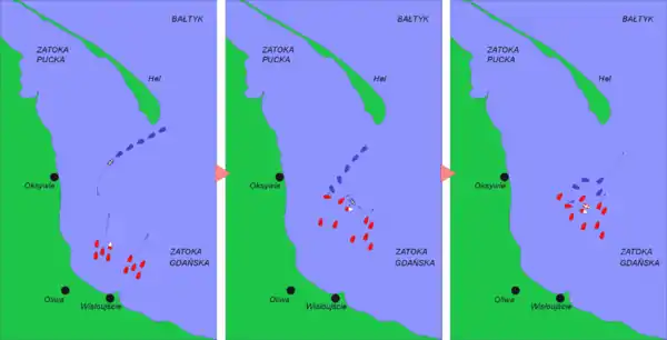 Від Гелю в напрямку Редлово пропливала для блокади Гданської затоки шведська ескадра (6 кораблів, 140 гармат, 700 моряків і солдат) і побачила на рейді польські кораблі (10 кораблів, 179 гармат, 1160 моряків і солдат). Вони вирішили атакувати двома групами: