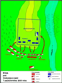 Єжи Любомирський, залишивши половину війська тримати Шереметєва й Цецюру в облозі, з другого боку скорим маршем рушив на Хмельницького і вдарив на нього під Слободищами. Перед світанком 7 жовтня 9 тис. добірних вершників, 500 драгунів, 1200 піхотинців та 10 гармат Є. Любомирського, а також 20 тис. татар нурадин-султана виступили проти українців. Їхній табір розташувався у вигідному місці на пагорбі й прикривався з лівого боку болотом, з правого — долиною, позаду — лісом. Навколо табору було вирито шанці й пороблено завали із зрубаних дерев. Наблизившись до нього, польний гетьман у центрі розташував німецьку й польську піхоту та драгунів, а на флангах — кінноту. Сам вирішив командувати правим крилом, керування лівим доручив Яну Собеському. Основні сили татар мали атакувати українців з тилу. Першими в наступ пішли підрозділи драгунів і піхоти, яких зустрів вогонь 20 гармат. Зазнавши відчутних втрат, нападники змістили напрям удару. Віднайшовши неукріплене окопами місце (його захищали тільки вози), вони зламали спротив козаків й увірвалися до табору. Значна частина козаків у паніці розпочала втечу до лісу, а решта, очолювана Іваном Богуном, Григорієм Гуляницьким, Тимошем Носачем, Петром Дорошенком та іншими полковниками, відчайдушно захищалася, даючи, за словами В. Коховського, густого вогню з самопалів, випадаючи з-за возів косами й сокирами відрубували коням ноги", Впевнені в тому, що перемогу вже здобуто, чимало поляків кинулися по здобич до наметів. Тим часом із лісу з'явилися татари, котрі напали на втікачів. Останні, прийшовши до тями, розвернулися й стрімко помчали в щойно залишений табір. Цей вимушений маневр став переломним. Увірвавшись до табору, козаки блискавично зайняли окопи й вал, вийшли в тил жовнірам і завдали потужного удару. Захоплені зненацька, ті розпочали панічну втечу. Вибивши їх до решти з табору, українці, розвиваючи успіх, обрушилися на польську кінноту, що саме в цей час підійшла до нього з обох боків, відкинули її. Є. Любомирський не хотів повірити в те, що перемога вислизнула з його рук, тому провів ще два потужні приступи табору, але безуспішно. Великі втрати (лише поляків було вбито й поранено близько 1 тис. осіб) змусили його відмовитися від свого наміру.