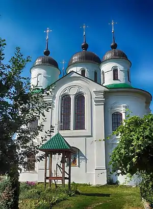 Благовіщенський чоловічий монастир УПЦ (МП) — споруджений за проектом Г. І. Устинова. В основі плану собору лежить хрест із рівними за довжиною раменами, на жодному з них немає традиційної півкруглої вівтарної апсиди. Між раменами хреста влаштовано чотири закруглені кутові прибудови. Вони не відділені стінами від внутрішнього простору собору, не типове для подібних споруд барокової доби. Бані храму поставлено по кутах (а не на раменах хреста), що відповідає давньоруським традиціям. Створені спеціальні яруси-лоджії для знаті, що відповідає місцевим прийомам побудови храмів. Під склепінням південно-східної бані влаштовано спеціальний майданчик, де певний час зберігали бібліотеку монастиря; вікна цієї бані закладені.