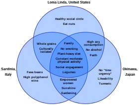 - Місто Лома-Лінда (Каліфорнія, США). Середня тривалість життя в містечку Лома-Лінда з населенням близько 23 тис. осіб, на 10 років більше, ніж в середньому по країні. Жінки тут живуть 91 рік, чоловіки — 89, а кількість ракових захворювань на 80 % менше, ніж в інших містах США. Велика частина місцевих жителів належить до релігійної громади адвентистів сьомого дня.