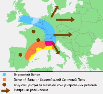 - південніше, вздовж узбережжя Середземного моря між Валенсією та Генуєю, — це Золотий банан або Європейський Сонячний Пояс
