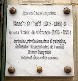 - Меморіальна дошка у Парижі з написом: «Les comtesses hongroises Blanche de Teleki (1806—1862) і Emma Teleki de Gérando (1815—1893), écrivains, revolutionnaires et patriotes, éminentes représentantes de l'amitié franco-hongroise, véc»