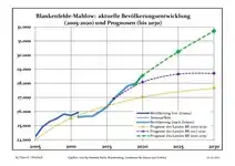 Динаміка населення з 1875 року в сучасних кордонах (Синя лінія: населення; Пунктир: відносна порівняльна динаміка населення землі Бранденбург; Сірий фон: період Третього рейху; Помаранчевий фон: період НДР)