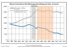 Динаміка населення з 1875 року в сучасних кордонах (Синя лінія: населення; Пунктир: відносна порівняльна динаміка населення землі Бранденбург; Сірий фон: період Третього рейху; Помаранчевий фон: період НДР)
