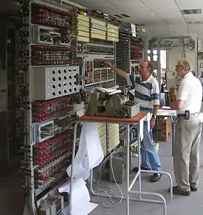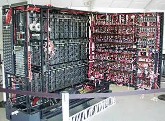 Bombe була електромеханічним пристроєм, функцією якого був пошук деяких зі щоденних налаштувань машин «Енігма» у різних комунікаційних мережах підрозділів німецьких військ.[61][62][63] Її новаторські схеми були створені Аланом Тюрінгом (з важливим внеском Гордона Велчмана), а сама машина була перенесена у креслення та створена Гарольдом 'Доком' Кіном з компанії «British Tabulating Machine Company». Кожна машина мала розміри бл. 2,1 метри у висоту і ширину та бл. 60 см в глибину та важила майже тонну.[64]