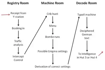 Не пов'язані з військово-морськими силами повідомлення Енігми розшифровувались у Будиночку № 6, передавались на переклад, індексування (каталогізацію) та перехресні посилання в Будиночок № 3. Лише після цього їх передавали до Таємної служби розвідки (MI6), начальникам служб розвідки у відповідних міністерствах та далі вищому командуванню на фронті.[38]