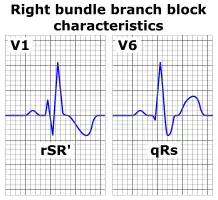 Вигляд ЕКГ «блокада правої ніжки пучка Гіса» вирізняється зміною комплексу QRS, що свідчить про активацію камер серця на ЕКГ. Ці зміни можуть відбуватися в різних формах. Як «повна блокада правої ніжки пучка Гіса», вони вказують на порушення провідності правої ніжки пучка Гіса (Тавари), яка забезпечує правий шлуночок як частина провідної системи серця. Однак, як «неповна блокада правої ніжки пучка Гіса», вони також можуть бути наявними у людей зі здоровим серцем без будь-якого патологічного значення.[1]
