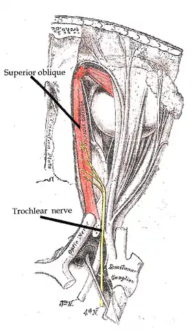 Блоковий нерв відносять до рухових нервів. Ядро блокового нерва розташоване в середньому мозку. Огинаючи ніжку мозку з латеральної сторони, нерв виходить на основу мозку, проходячи між ніжкою і скроневою частинами. Потім разом з окоруховим нервом виходить з черепа в очну ямку і іннервує верхній косий м'яз очного яблука.