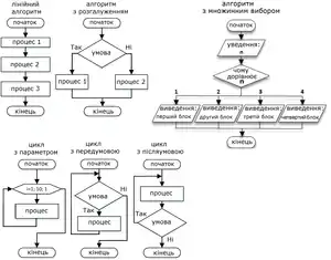 - Представлення алгоритму розв'язування або аналізу задачі за допомогою геометричних елементів (блоків), які позначають операції, потік, дані тощо.