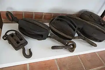 Блоки з караки «Мері Роуз»: такель-блок, одношківний і двошківний блоки, дерев'яний коуш, шків