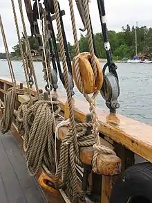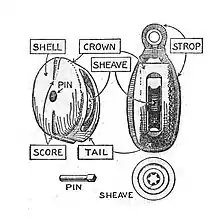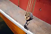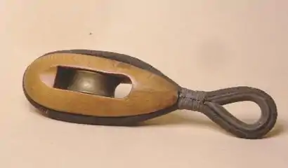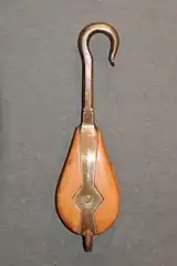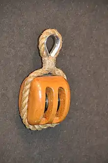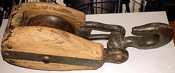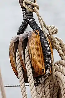 - Такель-блок (tackle block) — блок з двома шківами на різних осях[11].