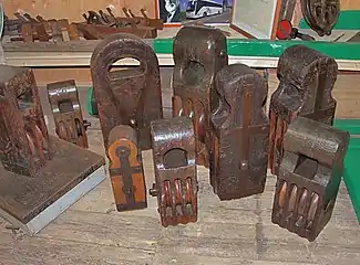 Старовинні блоки. Зліва направо: двошківний блок з гаком, одношківний остроплений блок з двома вічками і коушами, двошківний остроплений блок з одним вічком, лонг-такель-блок, каніфас-блок