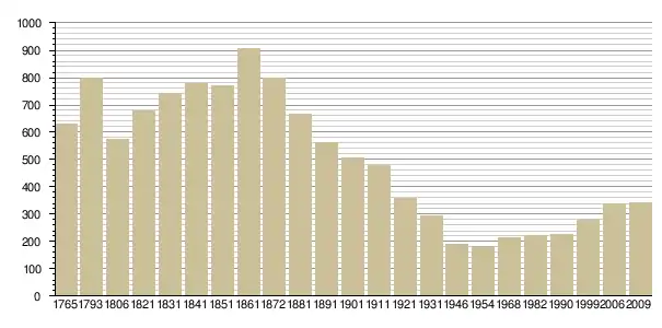 Динаміка населення (Baratier, Duby & Hildesheimer pour l’Ancien Régime[3], INSEE[4], EHESS[5] pour les chiffres issus des recensements légaux ):