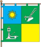 Квадратне полотнище поділене на чотири рівновеликі квадратні частини. На синій верхній древковій жовте сяюче шістнадцятипроменеве сонце. На зеленій верхній вільній білий плуг. На зеленій древковій нижній біла залізнична стрілка з зеленим вогнем.