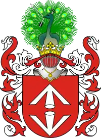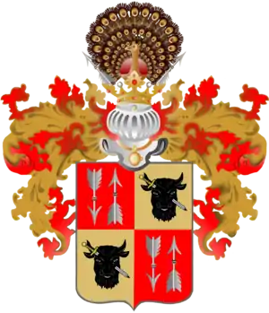 | Опис герба: Щит четверочастний. У першій і четвертій червених частинах дві срібні стріли в ряд, з яких права перекинута. У другій і третій золотих частинах чорна голова зубра пронизана срібним з золотим руків'ям мечем навскіс справа. Щит увінчаний дворянським коронованим шоломом. Клейнод: павич з розкритим хвостом поміж двох срібних стріл, що розходяться. Намет: червлений з золотом. | |