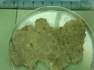 Губка гілляста, також існує у вигляді масивних кірок на занурених у воду предметах. Колір колоній, на які впродовж росту потрапляло світло, блідо-зелений. Колонії, які перебували в затінку, мають брудно-білий або сірий колір.