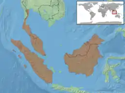Мешкає у південному Таїланді, на Малайському півострові, на Суматрі, Яві, Калімантан та низці дрібніших островів на південь від Суматри (Ментавай, Ніас, Сімелуе). Зустрічається у провінції Гуансі (Китай).