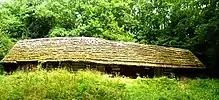 Дах будівлі, як правило, був утричі вищий від зрубу. Таку висоту досягали завдяки конструкції крокв, а також острішками, що продовжували стріху. Здебільшого дахи покривали соломою, рідше зустрічаються споруди з дерев'яним покриттям. Покриття соломою передбачало формування двох типів даху: ступінчастий (сходинками) та гладкий (рівний)[3].